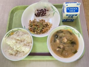 麦ごはん 魚汁 ゴーヤーチャンプルー ふちゃぎ 牛乳
