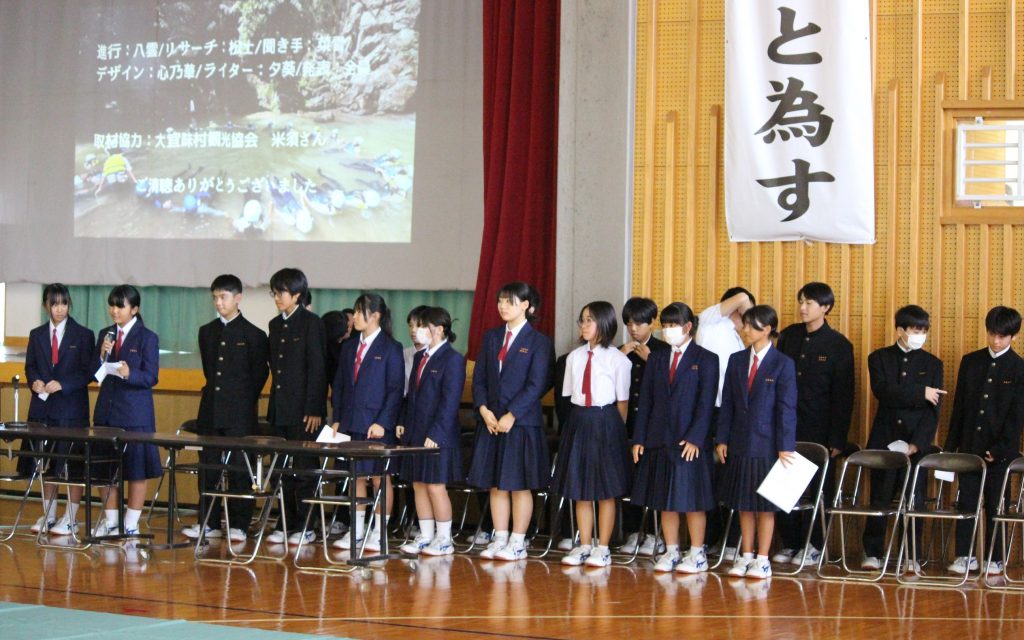 12月12日に、本校の総合的な学習の時間の学習成果を中心に発表する「くがにー発表会」を開催いたしました。本校では各教科で身につけた力を教科横断的に活用し「自ら課題を見つけ、探究し、他者と協働しながら、未来を切り拓く力を養う」ことを目標として、各学年が総合的な学習の時間を進めてきました。それらの学習を通して、大宜味村のよさ・課題を見つめ、自分が住むふるさとや社会全体の課題解決に向けて、自ら動き、他者と協働しながら、その都度の最適解を考え、実践できる人に向けて、少しずつ力を付けていって欲しいと思います。総合的な学習の時間等でお世話になりました、大宜味村の関係各所の皆様にこの場を借りて御礼申し上げます。ありがとうございました。